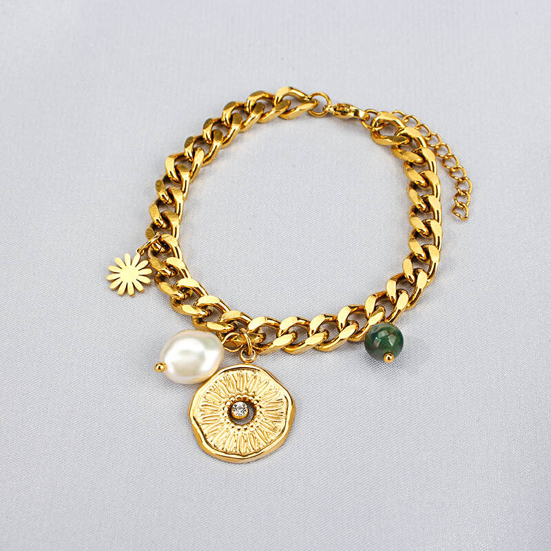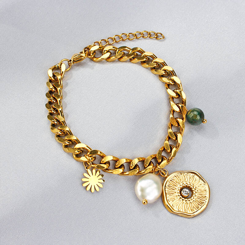 Fashion Bijoux Gold Exaggerated Simple Bracelet Flower Pearl With Natural Stone Stainless Steel Jewelry Women Bracelet
